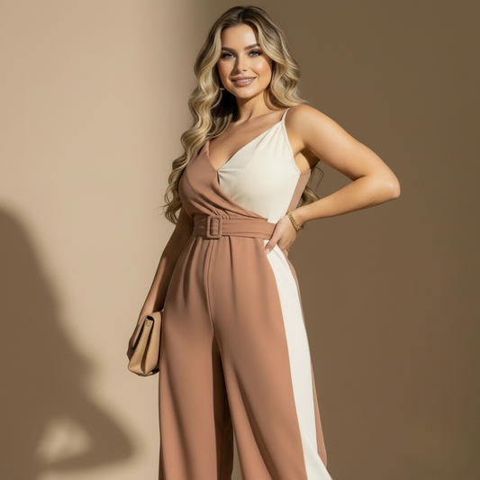 Enterizo bicolor con escote cruzado, tirantes delgados y pantalón ancho