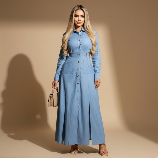 Vestido Largo de Jeans para Mujer con Botonera Frontal y Cinturón