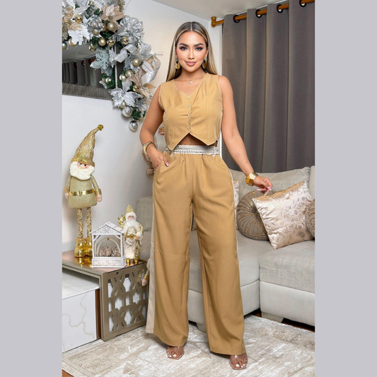 Conjunto de Mujer Pantalón Palazzo y Chaleco con Cinturón