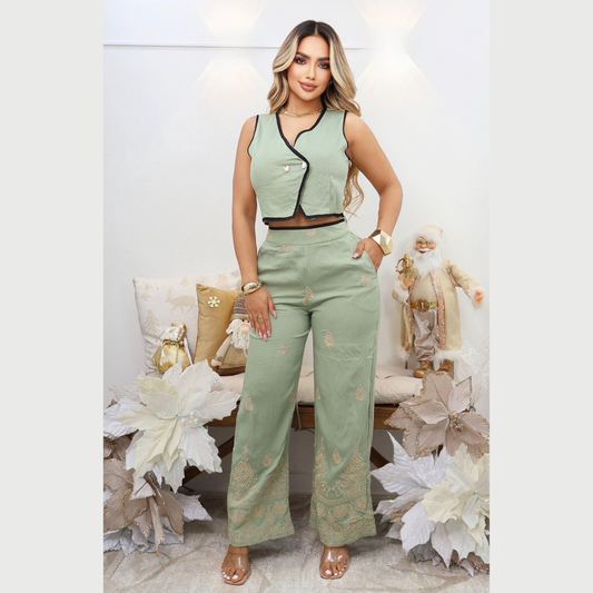 Conjunto de Pantalón Palazzo y Top Corto con Detalles Bordados