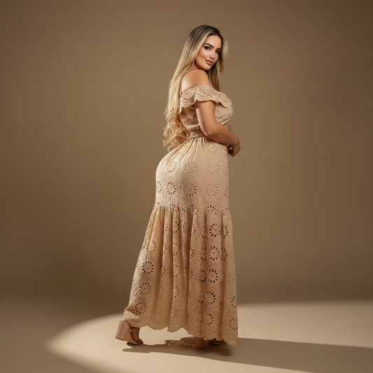 Vestido elegante ajustado con encaje y hombros descubiertos