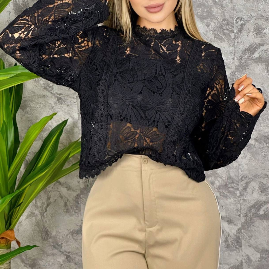 Blusa femenina de crochet floral con diseño transparente, cuello alto y mangas largas ligeramente amplias. Su confección en encaje de calidad aporta un estilo delicado y sofisticado, ideal para combinar con faldas, pantalones de vestir o jeans en looks elegantes y versátiles. Perfecta para reuniones, salidas especiales o eventos donde se busca un toque romántico y moderno.