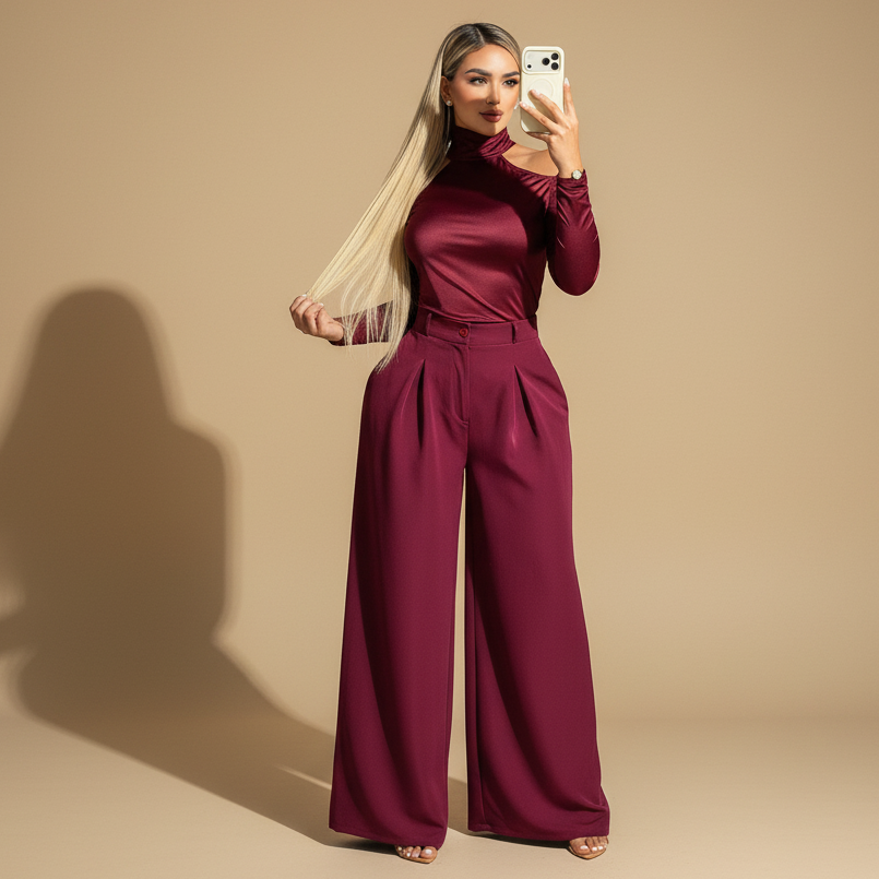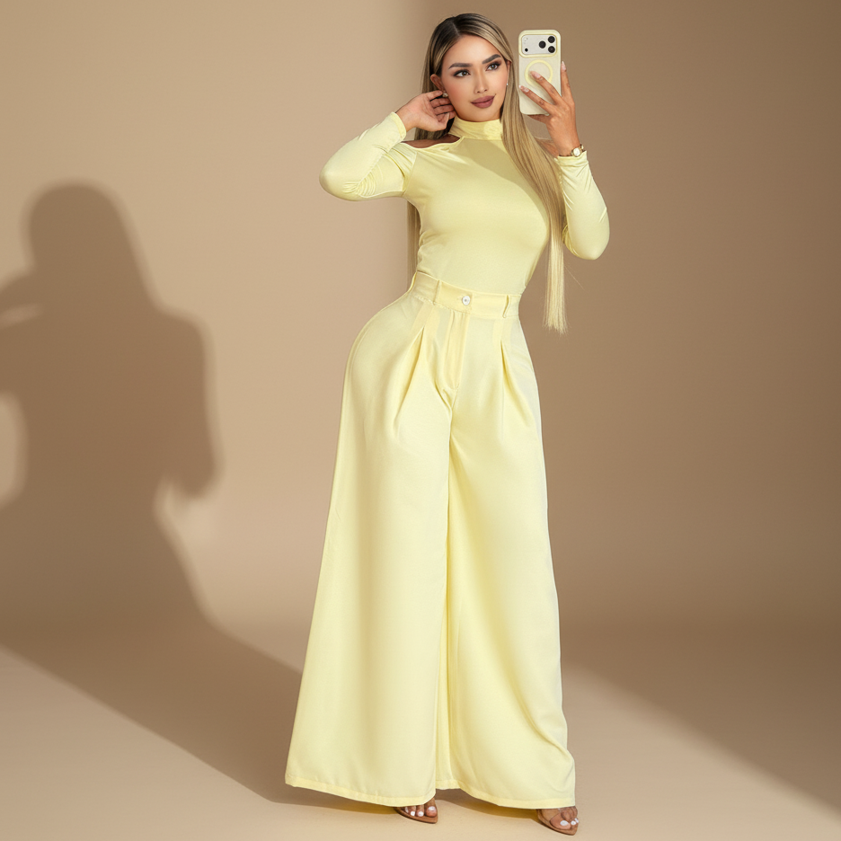 Conjunto femenino de dos piezas con top de manga larga y pantalón tipo palazzo de tiro alto que estiliza la silueta. Ideal para looks elegantes, modernos y ocasiones especiales.