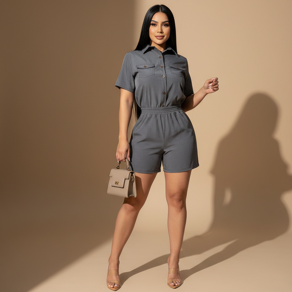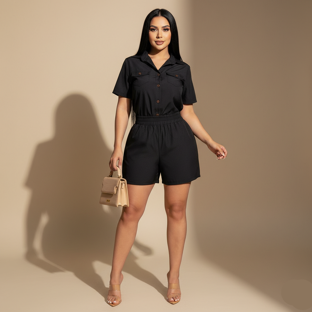 Conjunto sofisticado de camisa manga corta con bolsillos frontales y botones tono a tono. Short estructurado con cintura ajustada y caída definida.