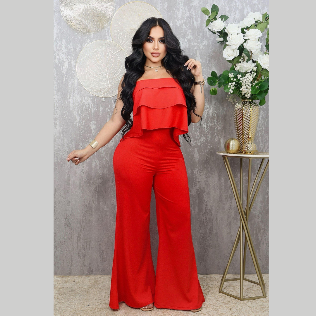 Conjunto femenino de dos piezas compuesto por un top sin tirantes con volantes en capas y pantalón bota ancha de tiro alto.