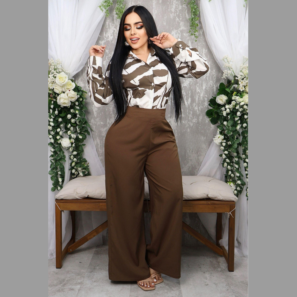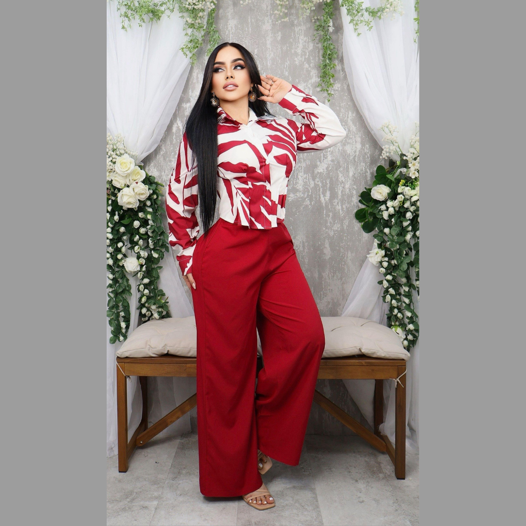 Luce sofisticada con este conjunto formal de dos piezas, ideal para oficina o reuniones importantes. Incluye una camisa estampada con diseño abstracto y botones al frente, combinada con un pantalón palazzo de tiro alto y caída amplia que estiliza la silueta. Una opción moderna y versátil que realza tu presencia con elegancia. Disponible en tallas S, M y L. Envíos a nivel nacional.