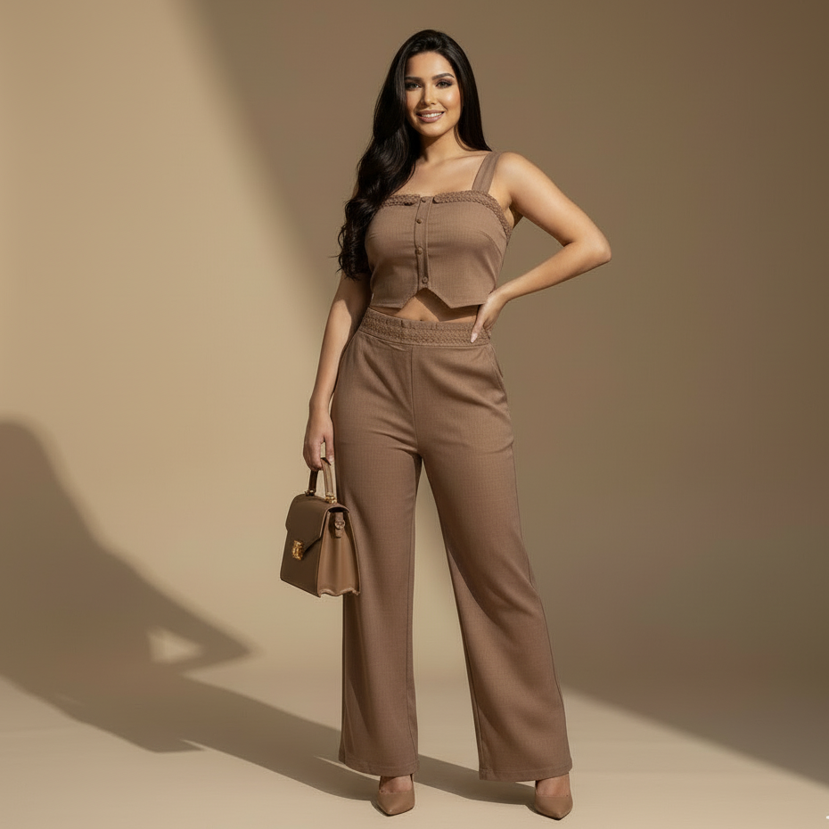 Conjunto de dos piezas en color café. Top con tirantes anchos, escote recto y botonera frontal visible. Presenta terminación inferior en forma de pico. Pantalón de tiro alto, con pretina lisa, pierna recta y largo al tobillo.