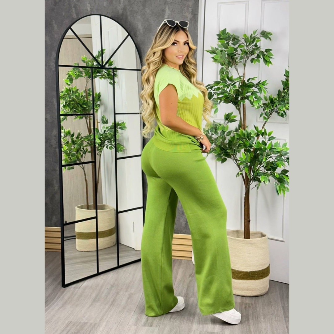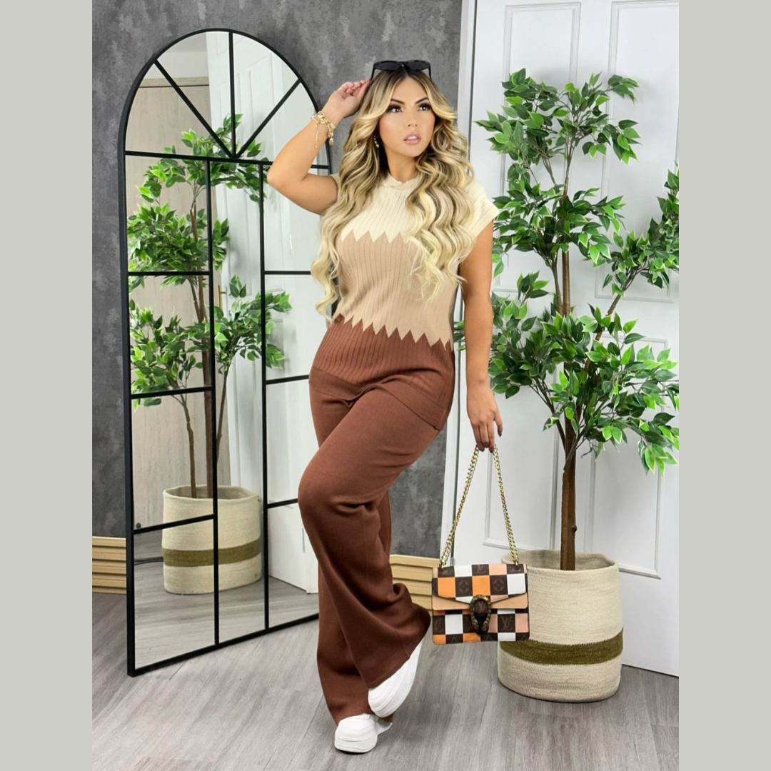 Conjunto tejido de dos piezas. Incluye pantalón amplio de caída fluida y blusa de manga corta con diseño en zigzag