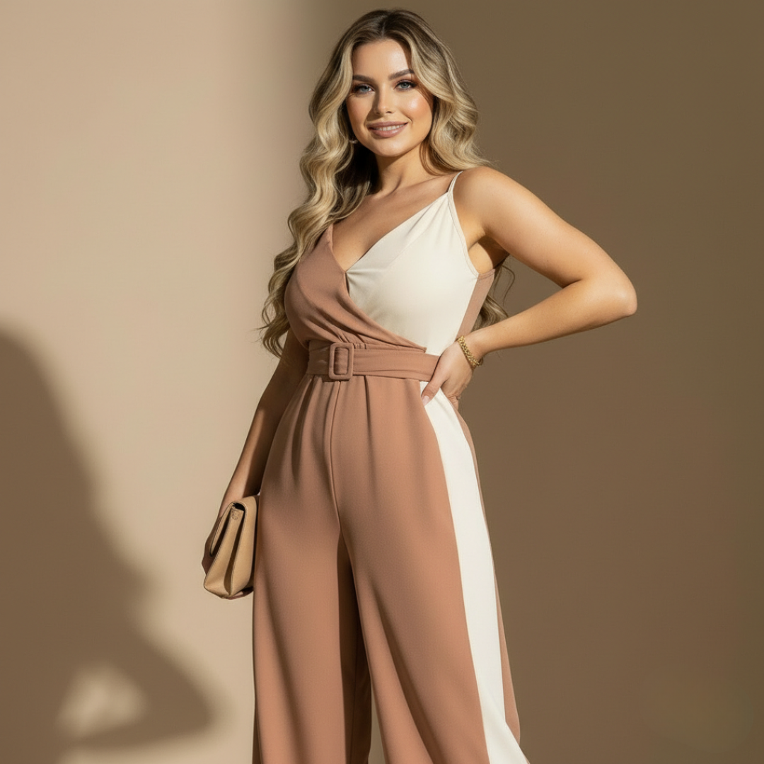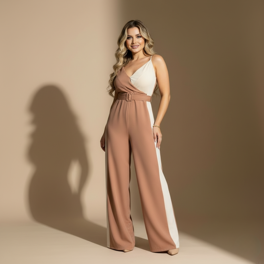 Enterizo bicolor con diseño asimétrico en la parte superior, escote cruzado en “V” y tirantes delgados. Presenta cintura definida con cinturón del mismo material y hebilla rectangular integrada al diseño. El pantalón es de corte recto amplio, con caída larga y líneas limpias. El contraste de tonos se mantiene de forma vertical en el cuerpo y el pantalón, Diseño continuo en una sola pieza, sin mangas, con estructura definida y terminaciones minimalistas.