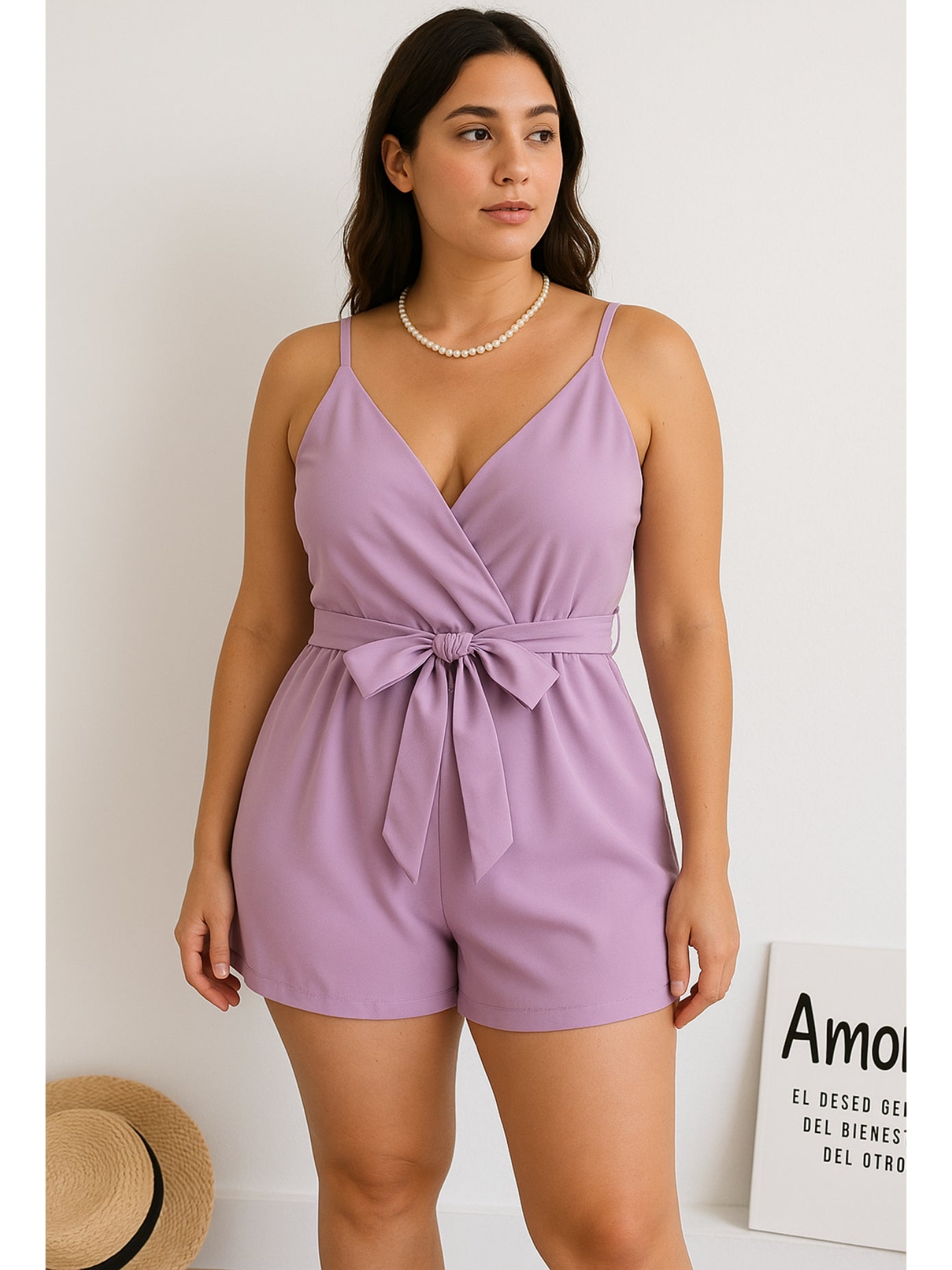 Este hermoso romper en tonos unicolor es la combinación perfecta de elegancia y frescura. Diseñado con tirantes delgados y un escote en V sutilmente favorecedor, ofrece un ajuste ligero y fluido que realza tu figura. Su lazo ajustable en la cintura permite personalizar el ajuste, brindando comodidad y estilo al mismo tiempo.