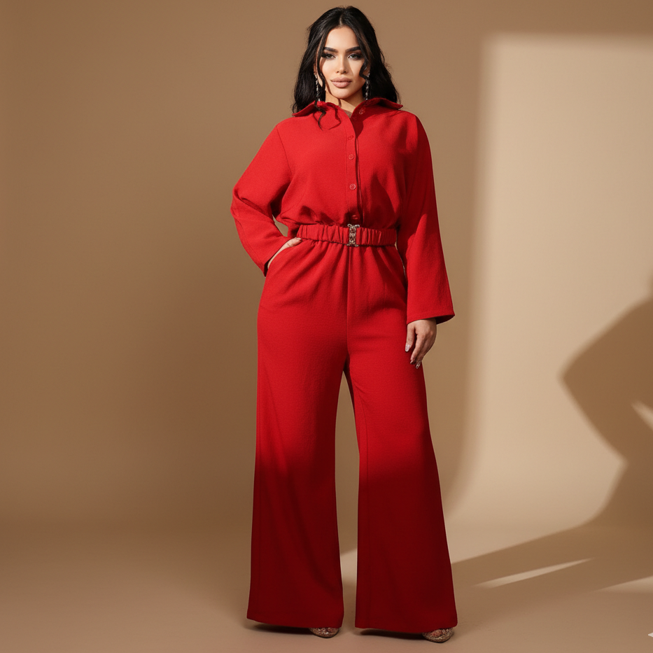Enterizo palazzo para mujer con camisa manga larga y cinturón elegante