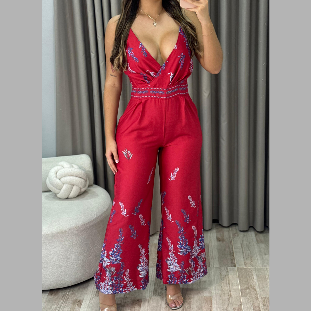 Enterizo con estampado floral, escote cruzado profundo y detalle de cintura bordada