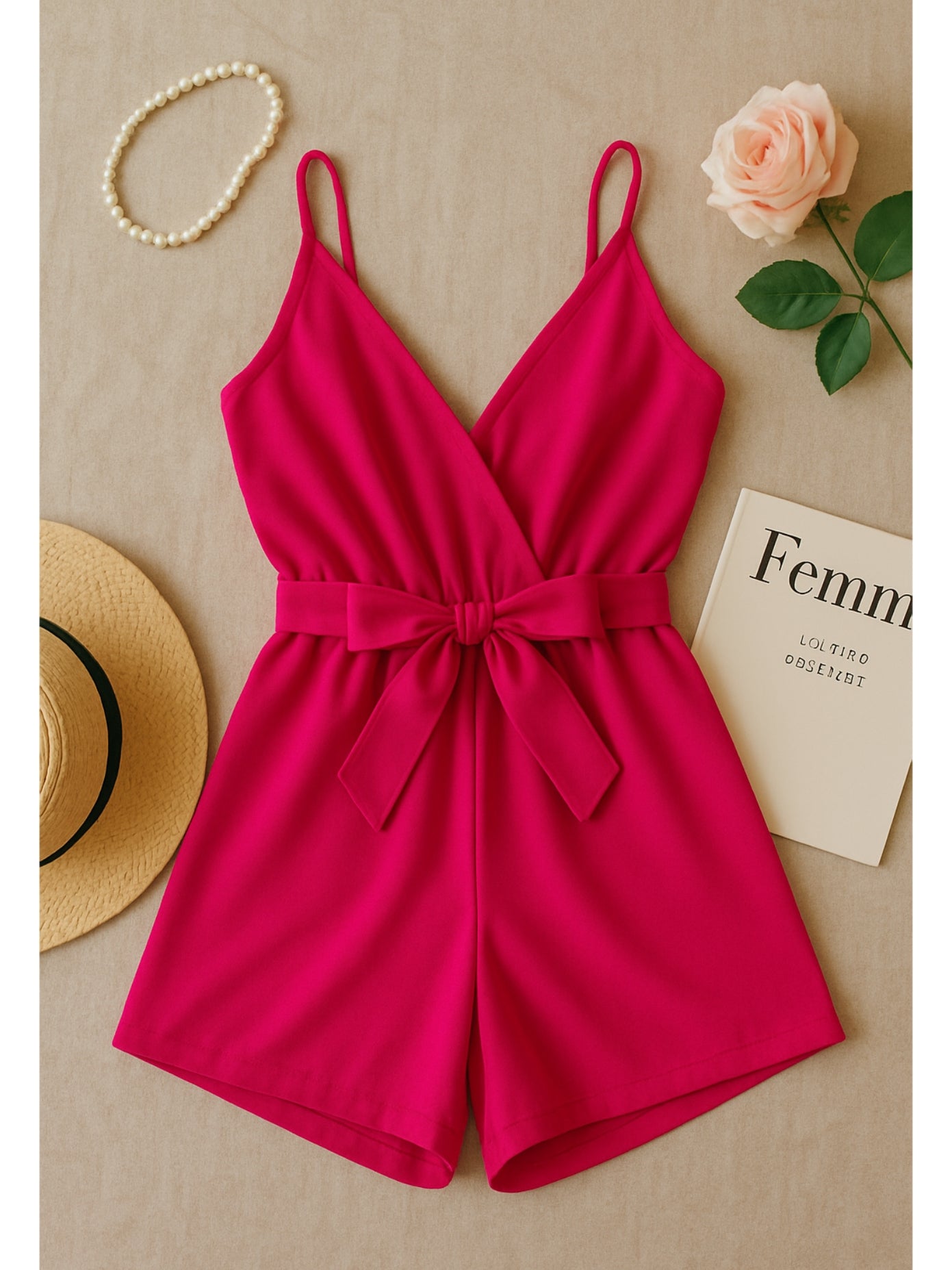 Este hermoso romper en tono crema es la combinación perfecta de elegancia y frescura. Diseñado con tirantes delgados y un escote en V sutilmente favorecedor, ofrece un ajuste ligero y fluido que realza tu figura. Su lazo ajustable en la cintura permite personalizar el ajuste, brindando comodidad y estilo al mismo tiempo.