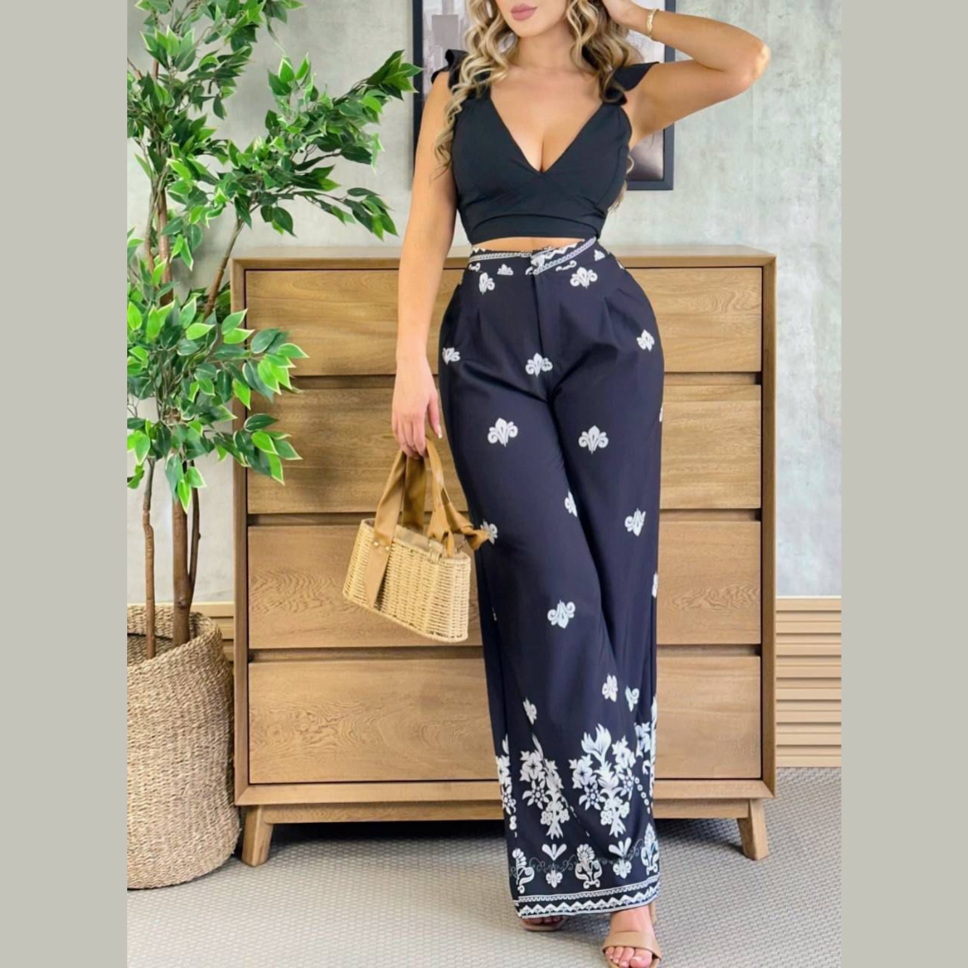 Set de top corto con tirantes decorativos y pantalón largo estampado