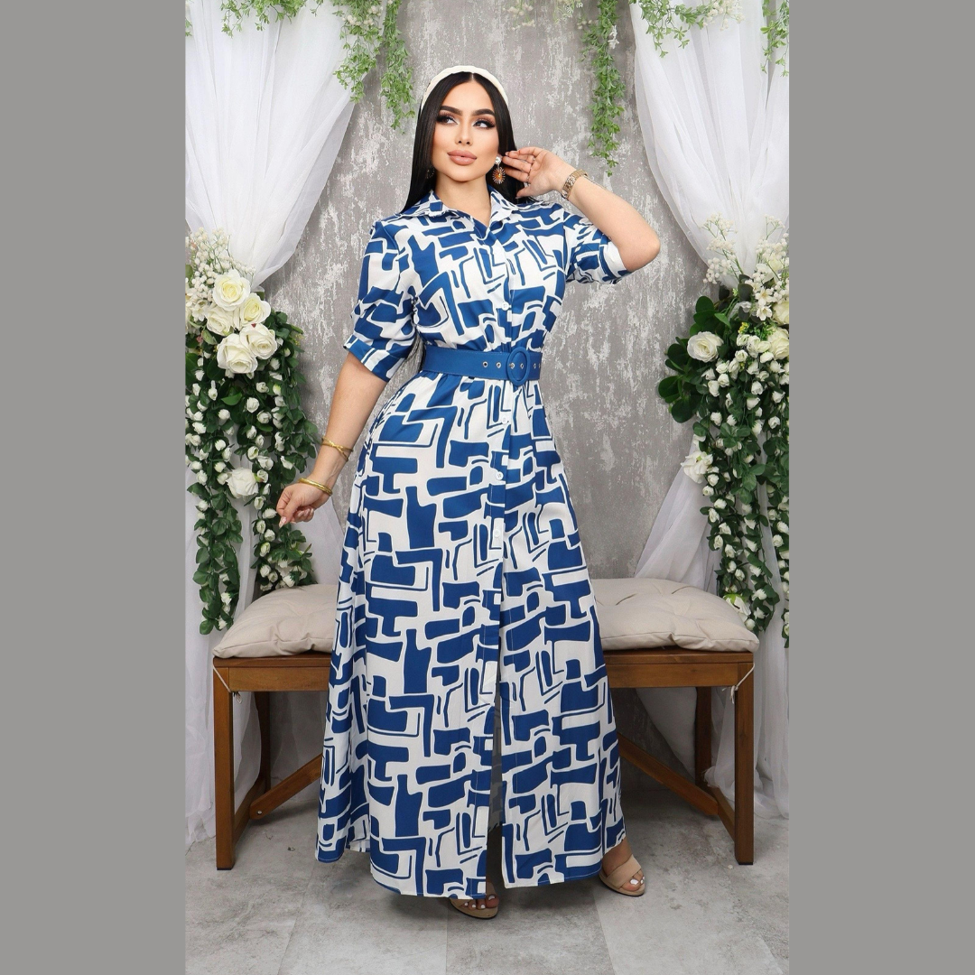 Este vestido camisero largo combina elegancia y estilo moderno. Confeccionado en tela liviana, presenta un llamativo estampado geométrico, ideal para destacar en cualquier ocasión. Su cinturón ajustable define la cintura y aporta estructura, mientras que la botonadura frontal permite un ajuste cómodo. Perfecto para eventos, reuniones o salidas casuales.