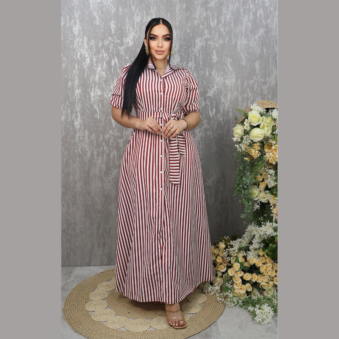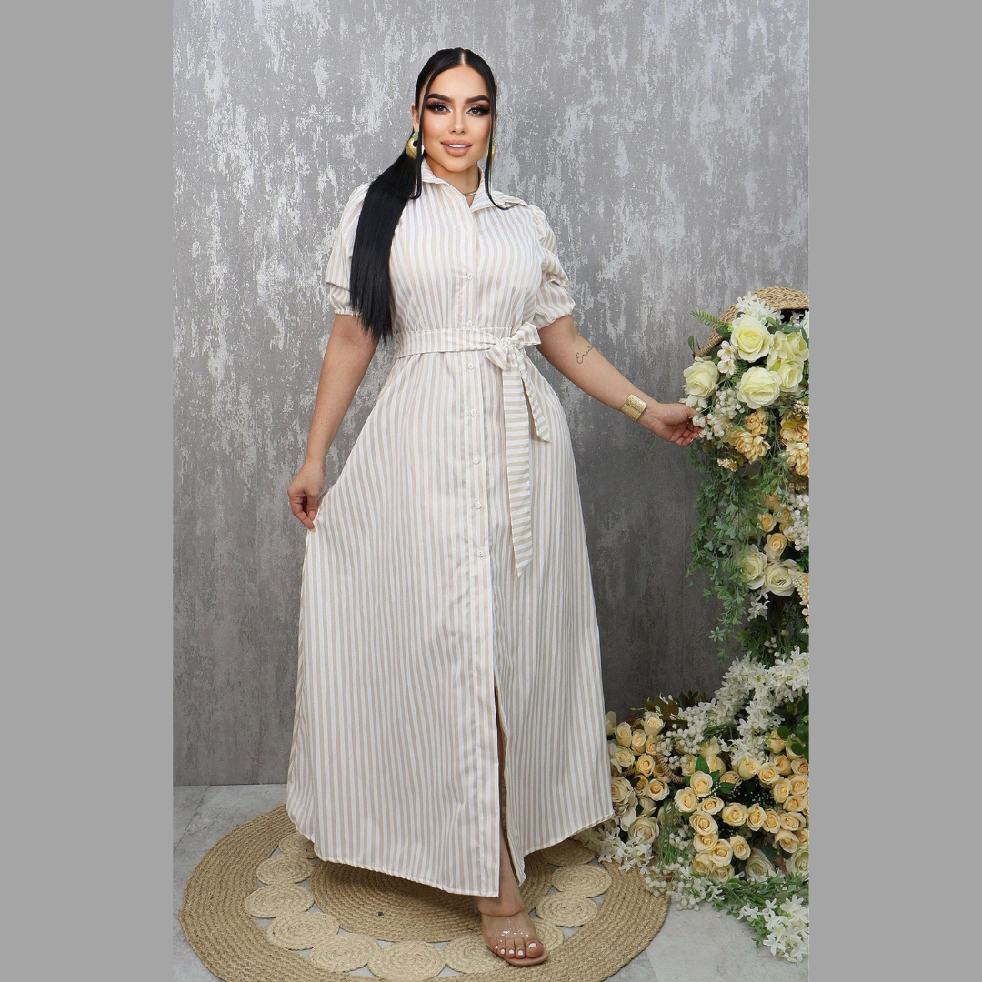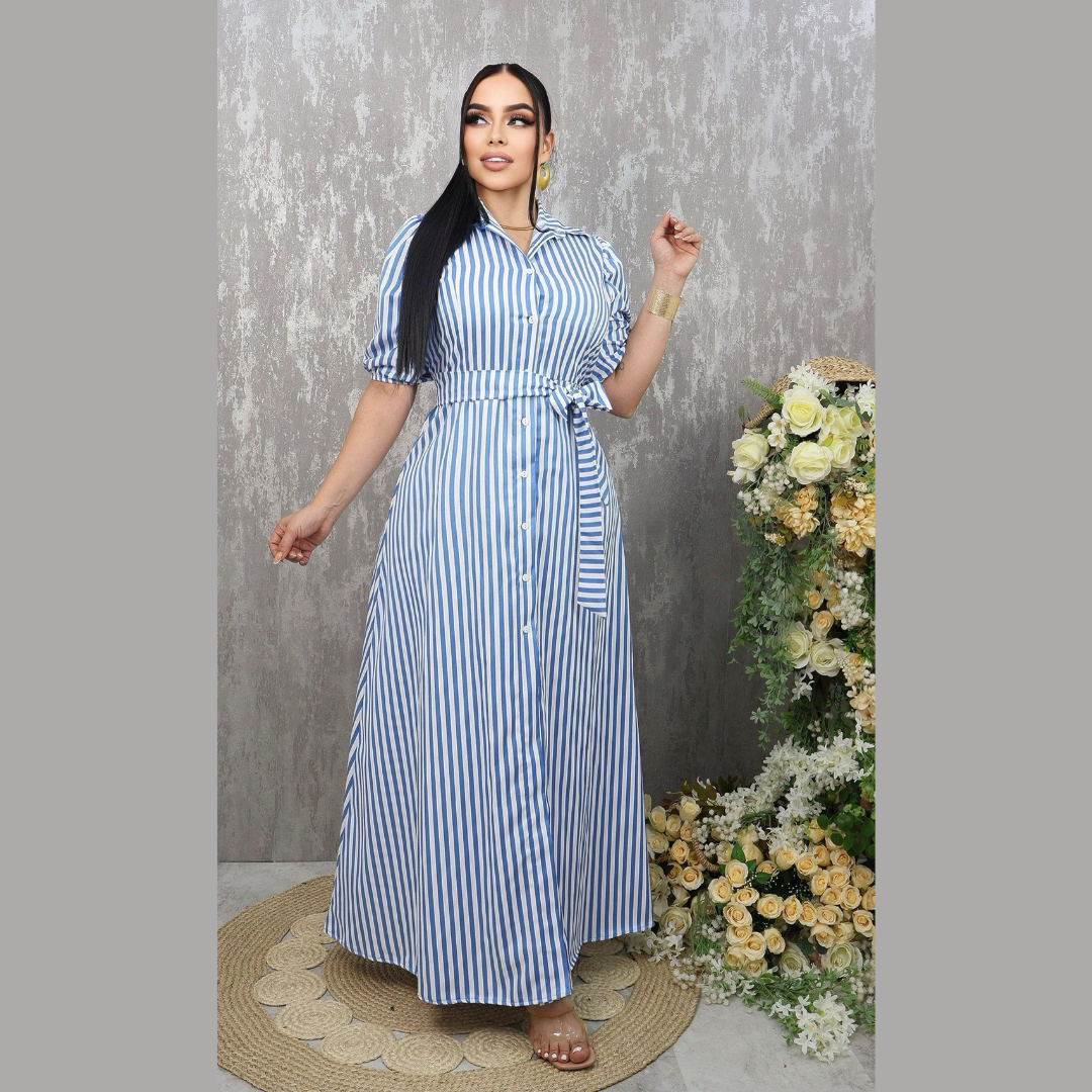 Vestido largo de corte camisero con botones frontales y cinturón ajustable en la cintura para estilizar la figura. El diseño presenta rayas verticales que alargan visualmente el cuerpo y mangas tipo globo con elástico para un toque moderno. Ideal para outfits casuales o elegantes, gracias a su caída fluida y estilo versátil.