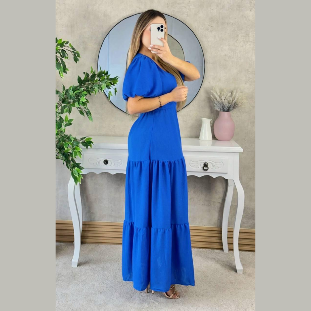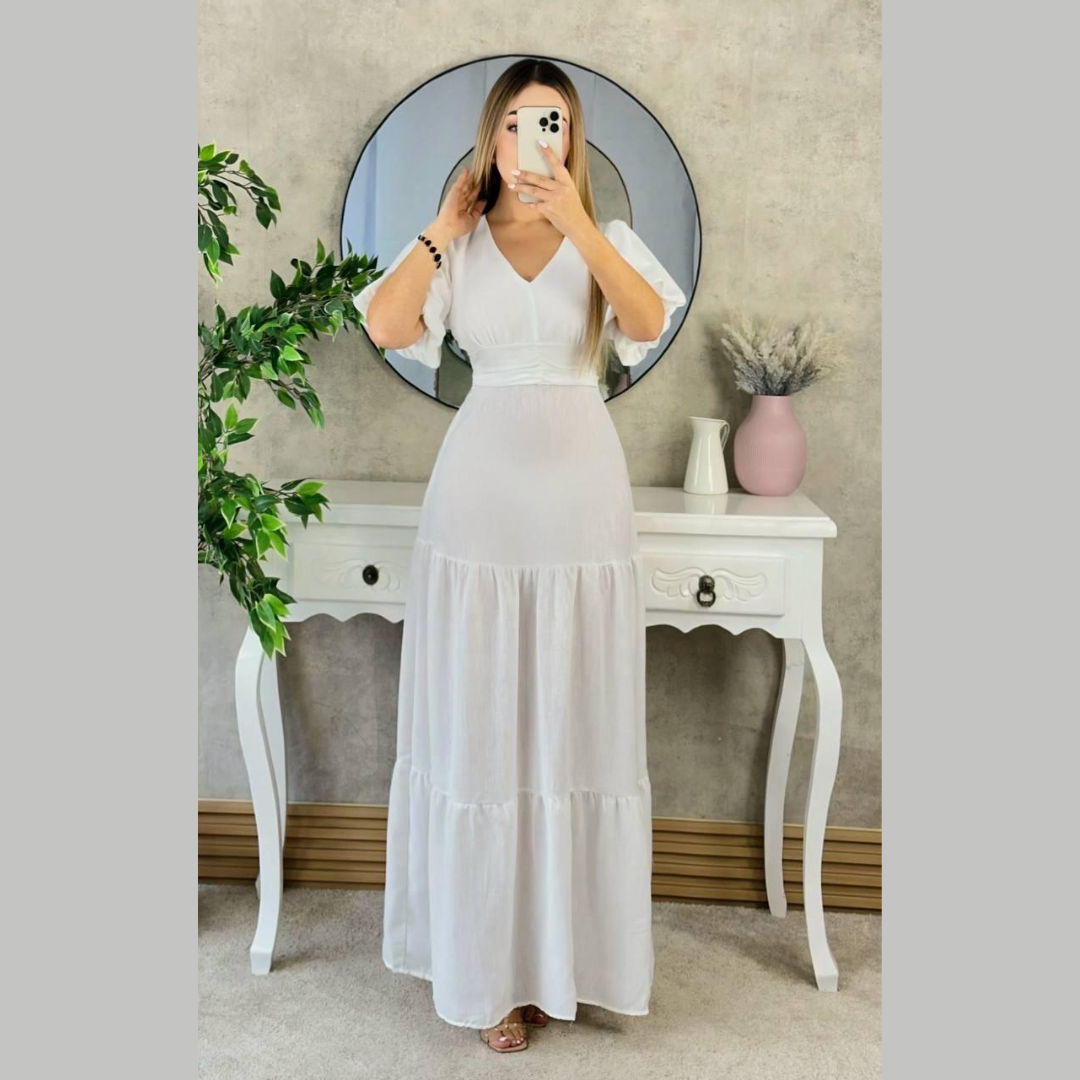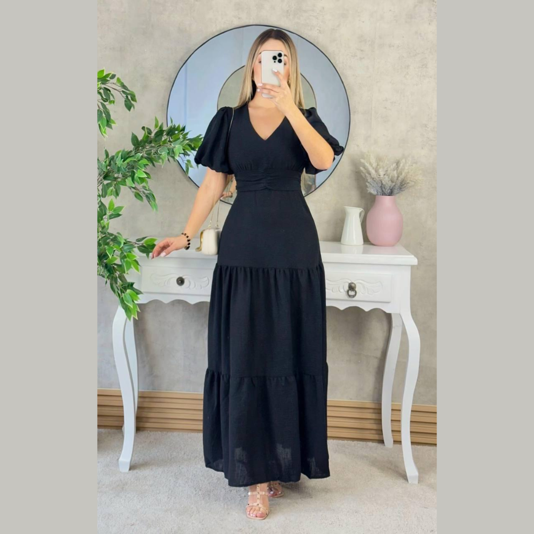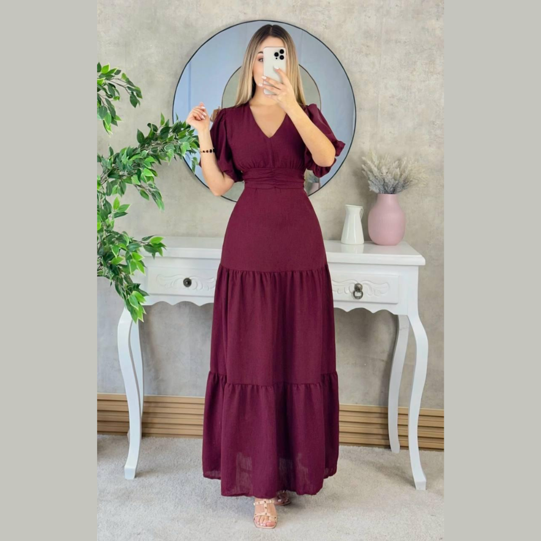 Vestido largo en tono burdeos, confeccionado en tela liviana con caída fluida. Presenta escote en V cruzado, mangas cortas tipo globo y pretina ancha que enmarca la cintura. Su diseño de falda amplia con volantes escalonados aporta movimiento y elegancia. Ideal para eventos formales, cenas o celebraciones especiales. Favorece todo tipo de siluetas gracias a su corte estilizado y femenino.