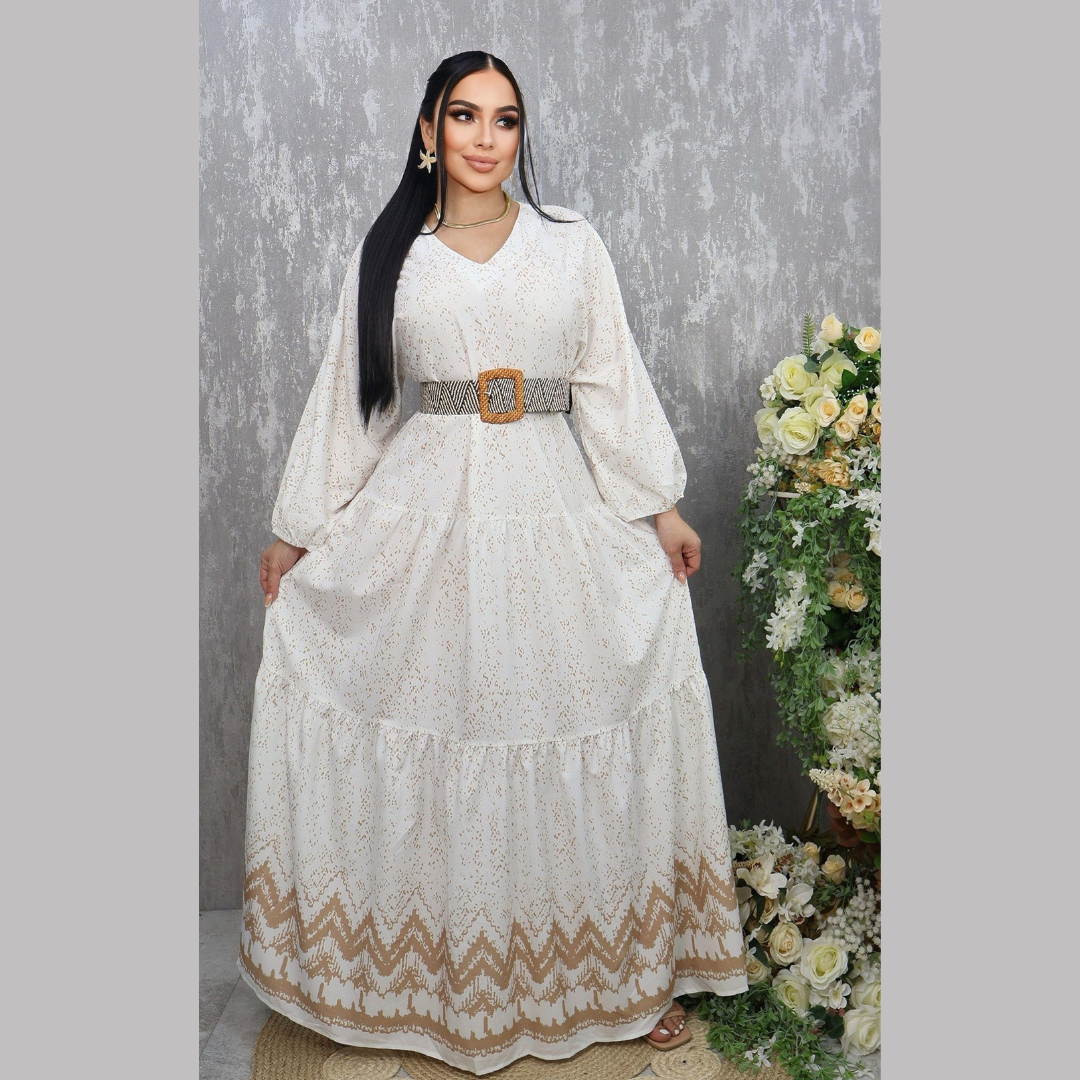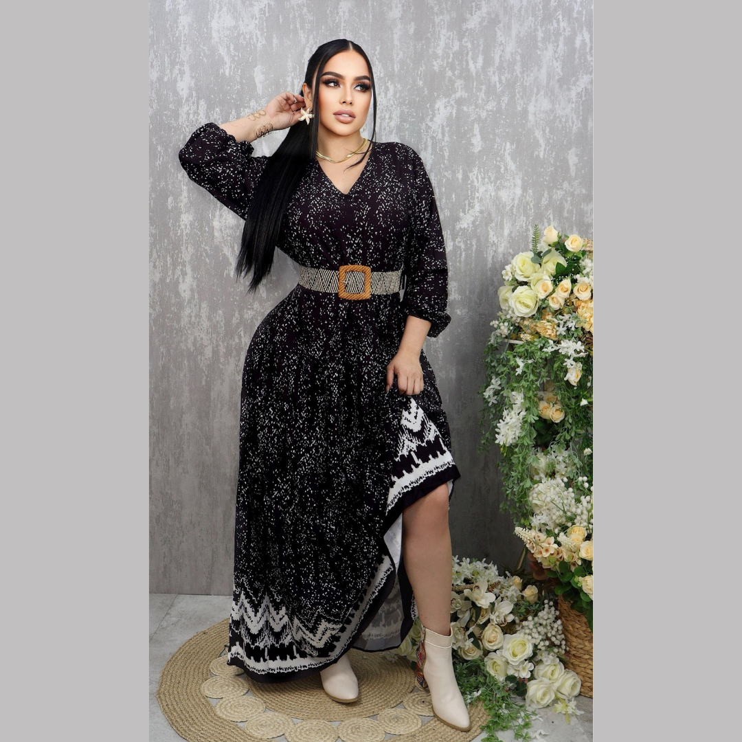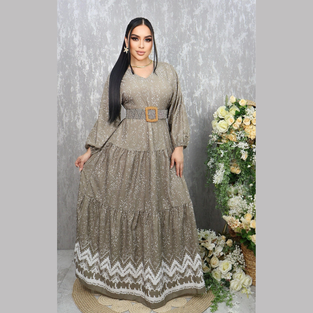 Descubre nuestro hermoso vestido largo con un diseño elegante y toques bohemios. Este maxi vestido presenta un cuello en V, mangas holgadas y un cinturón texturizado de hebilla cuadrada que acentúa la cintura. Su estampado único en la falda añade un toque distintivo. Ideal para eventos casuales, vacaciones o un look chic de día. ¡Encuéntralo ahora y realza tu estilo!