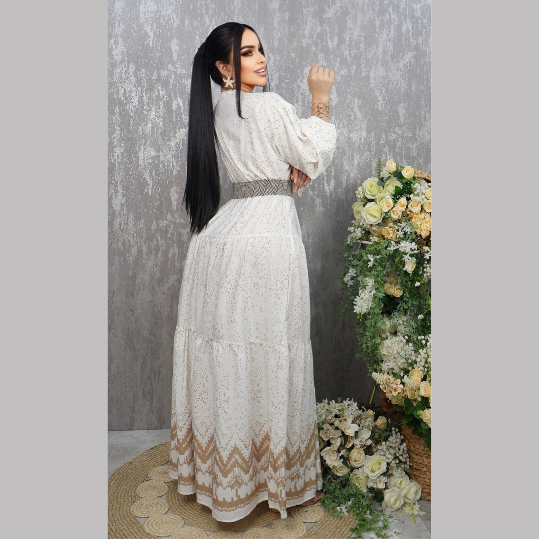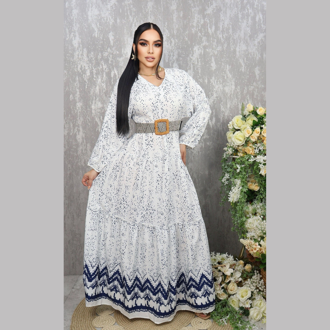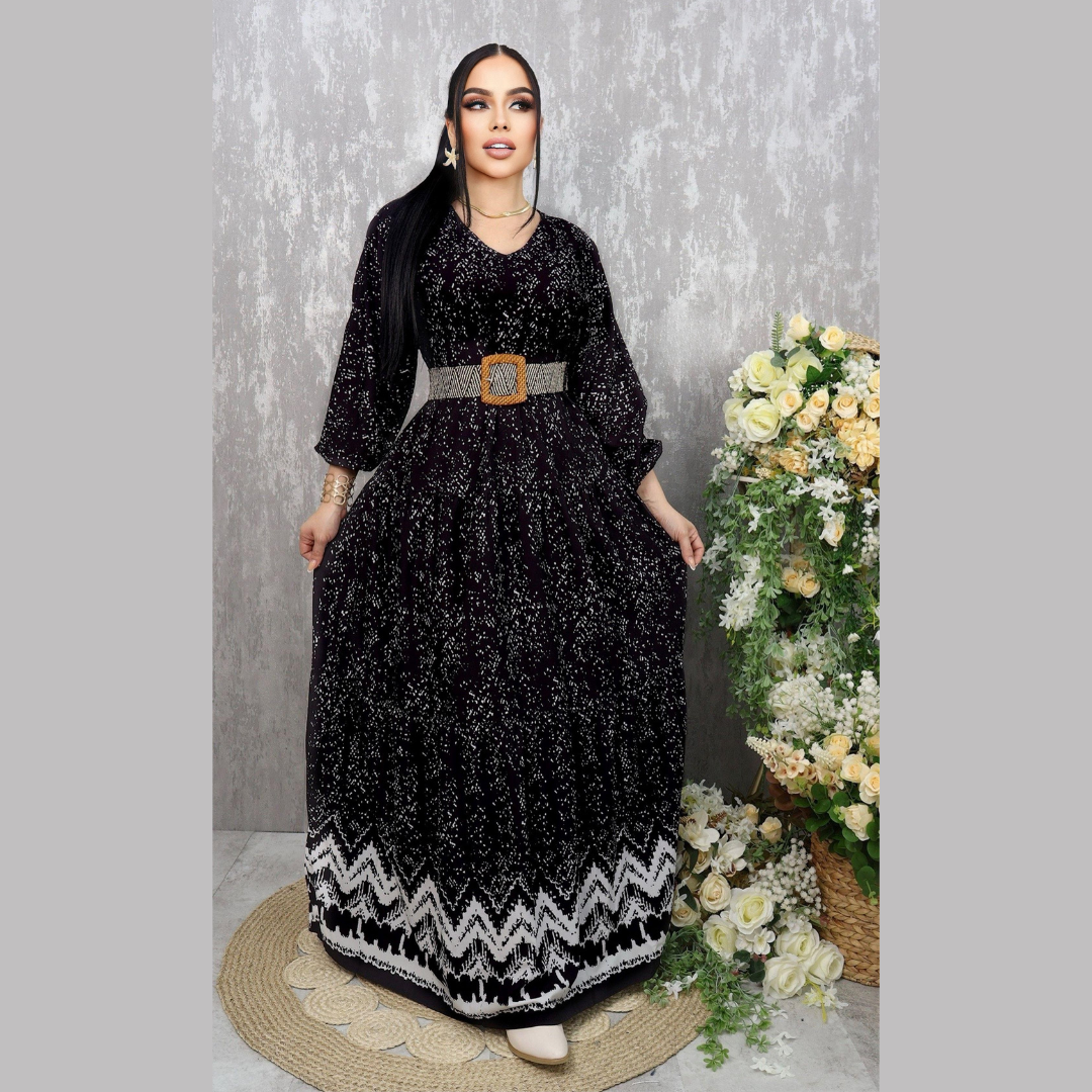 Descubre nuestro hermoso vestido largo con un diseño elegante y toques bohemios. Este maxi vestido presenta un cuello en V, mangas holgadas y un cinturón texturizado de hebilla cuadrada que acentúa la cintura. Su estampado único en la falda añade un toque distintivo. Ideal para eventos casuales, vacaciones o un look chic de día. ¡Encuéntralo ahora y realza tu estilo!