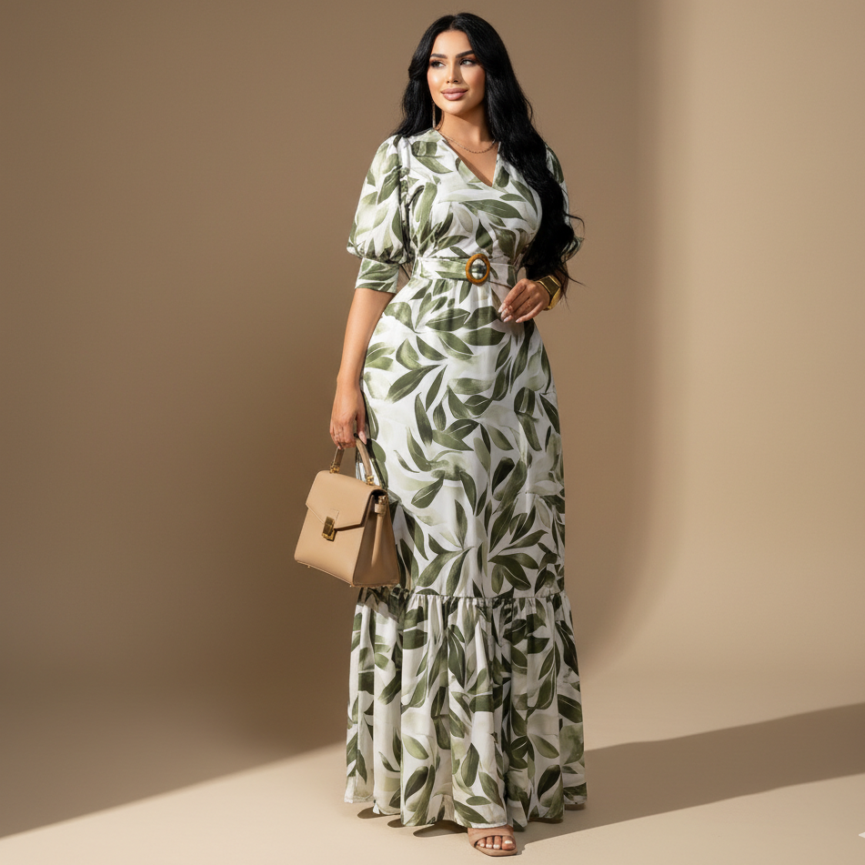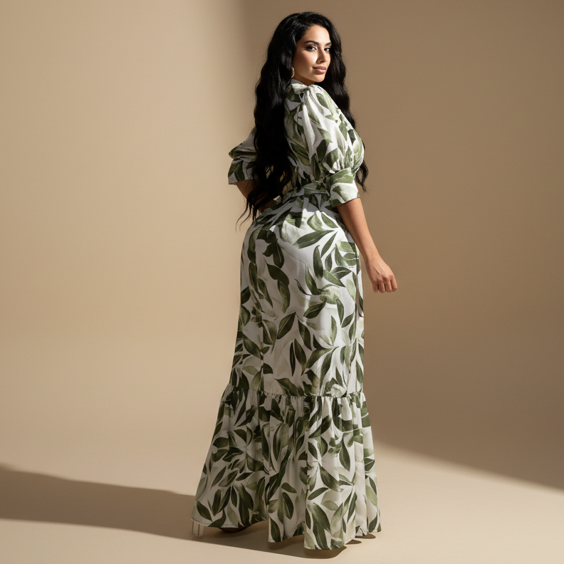 Vestido largo de silueta estructurada, con escote en línea limpia, mangas suaves y falda amplia con caída natural.