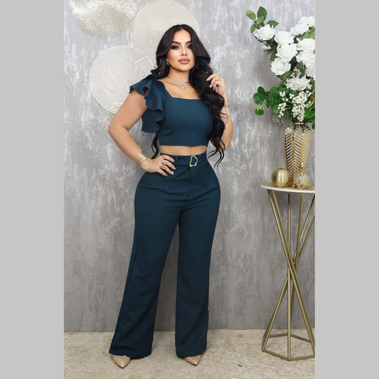 Conjunto de dos piezas con top de volantes y pantalón tiro alto