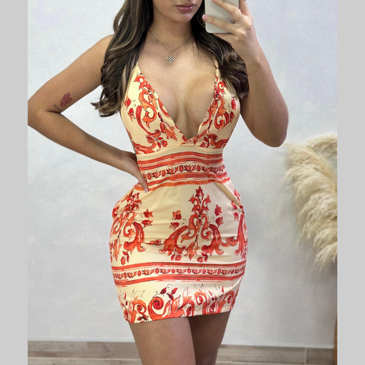 Vestido corto femenino con tirantes y diseño estampado en capas